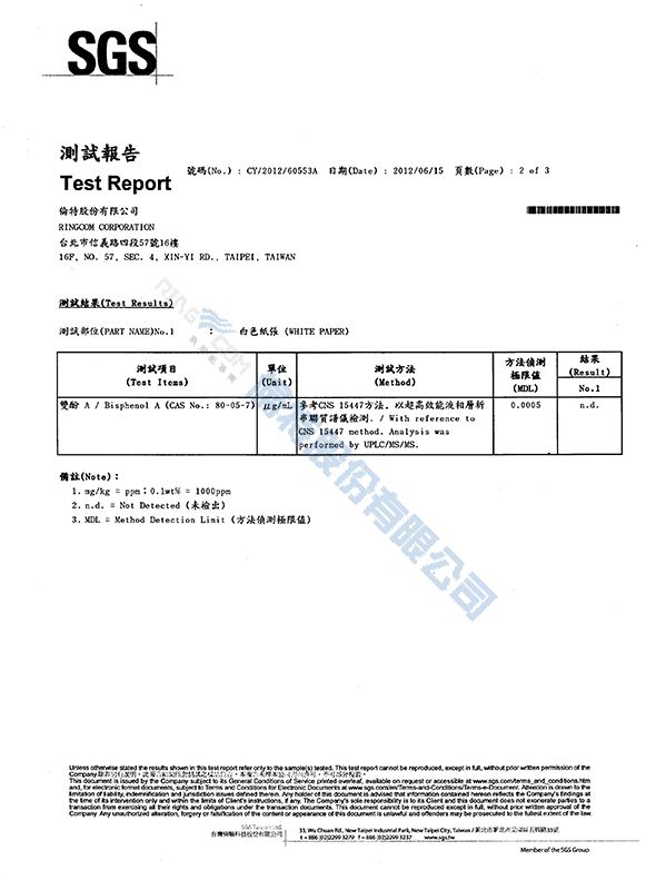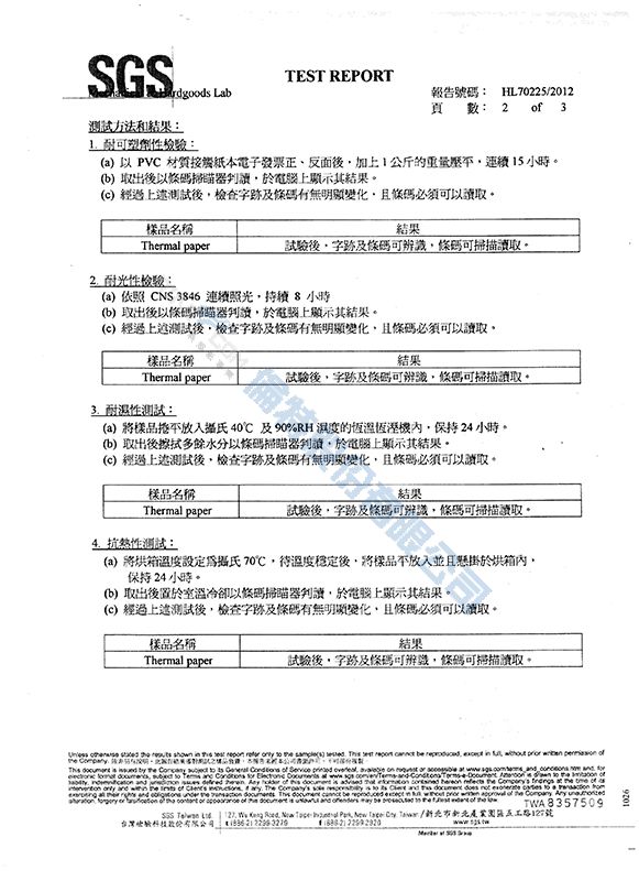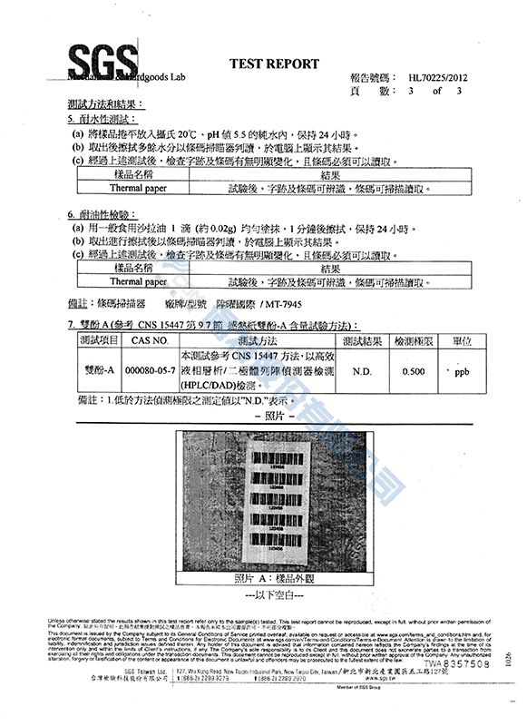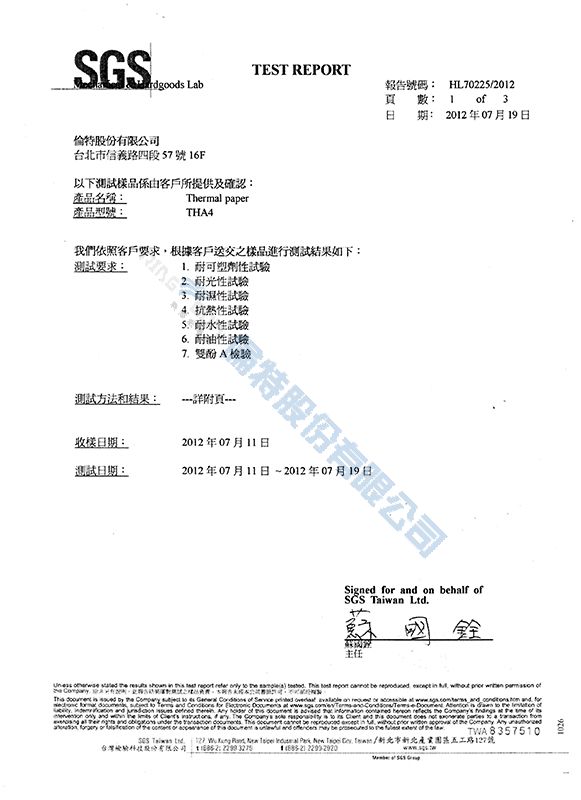 倫特公司所有的熱感紙產品皆有SGS不含雙酚A認證證明、電子發票紙也通過財政部八大項檢測。為客戶提供最安心的品質保證。